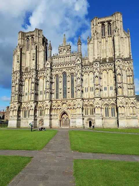Wells Cathedral presents a blend of Early English and Decorated Gothic, characterized by its sculpted façade, ornate chapter house, and intricate scissor arches. Its serene beauty captivates visitors.