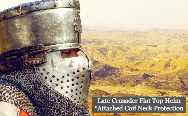 The main disadvantage of this crusader’s flat top helm helmet was its flat top that would take the full force of an enemy blow, however, historians believe that historical evidence concludes that knights probably also wore padding, a chainmail coif, and a secondary helmet underneath called the Cervaillier to counter this problem.