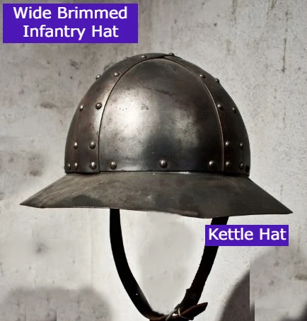 The Kettle Hat was a popular helmet with infantry soldiers, it was very popular during the 13th century. The Kettle Hat had a wide brim that offered protection from downward blows.