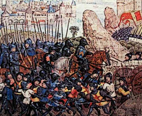 English forces under Edward laid siege to the city in September 1346 and gained access to the city only in August 1347 when the citizens surrendered due to the lack of provisions inside the city walls.