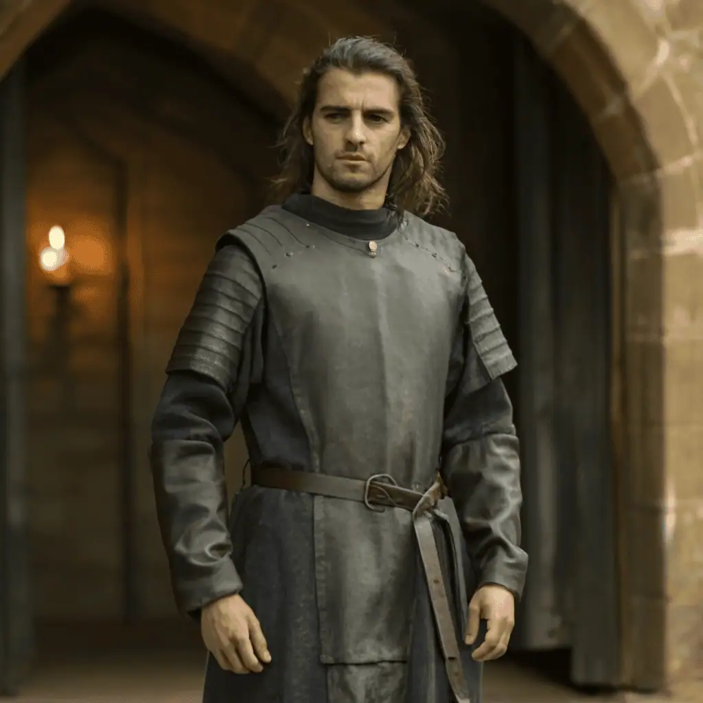 The surcoat was a loose, outer garment worn over the tunic. It had wide sleeves and often featured a coat of arms or decorative motifs.