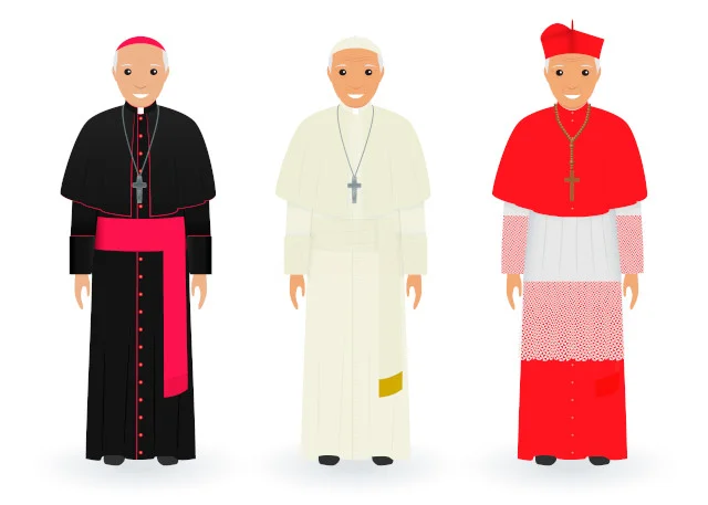 Pope, cardinal and bishop. Supreme catholic priests in cassocks.