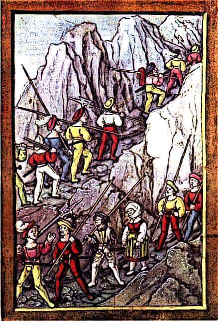 Crossbowmen were usually employed in advanced positions, they shielded themselves from enemy fire with large oblong pavise shields during battles of the 14th to early 16th centuries.